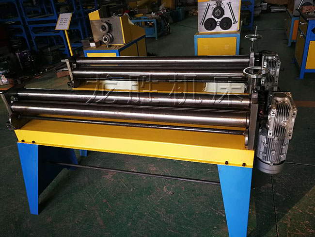 该机结构形式为三辊非对称式,上辊为主传动,下辊垂直升降运动,以便夹紧板材,并通过下辊齿轮与上辊齿轮啮合,同时作为主传动;边辊作倾升降运动,具有预弯和卷圆双重功能。结构紧凑,操作维修方便。