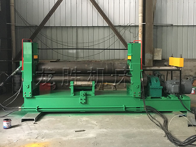 该机结构型式为三辊对称式,上辊在两下辊中央对称位置作垂直升降运动,通过液压缸内的液压油作用于活塞而获得,为液压传动,两下辊作旋转运动,通过减速机的输出齿轮与下辊齿轮啮合,为卷制板材提供扭矩。